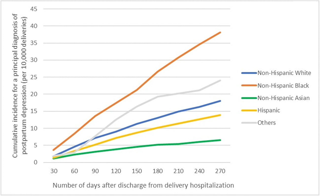 Source: Chan, A. L., Guo, N., Popat, R., Robakis, T., Blumenfeld, Y. Y., Main, E., Scott, K. A., & Butwick, A. J. (2020, May 30). Racial and ethnic disparities in hospital-based care associated with Postpartum Depression. Journal of racial and ethnic health disparities. https://link.springer.com/article/10.1007/s40615-020-00774-y