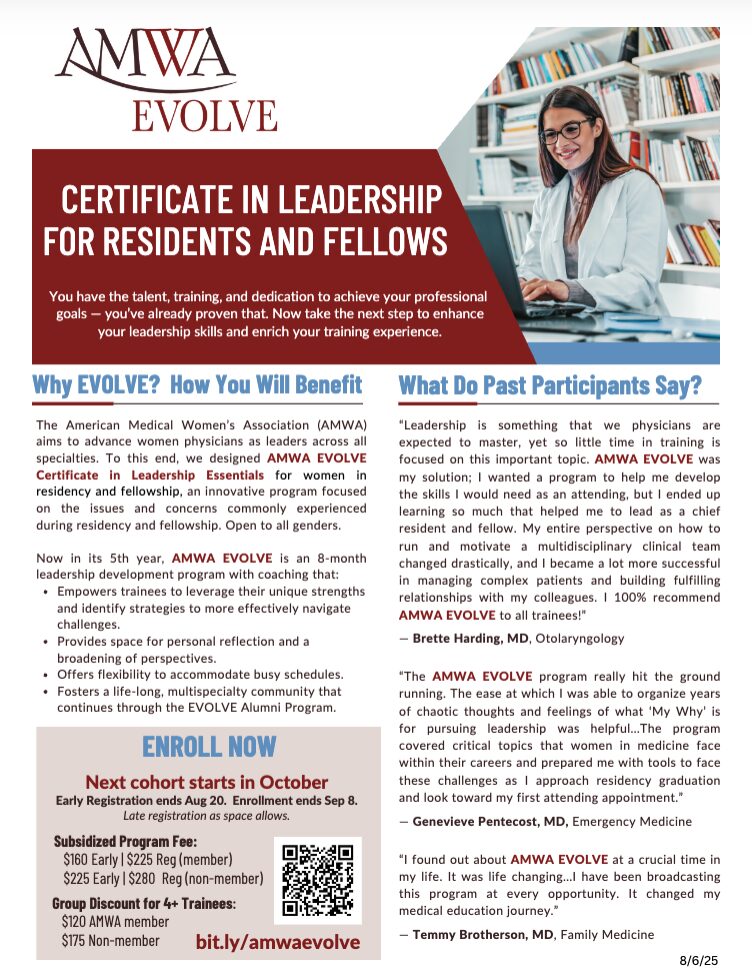 “Leadership is expected of physicians, yet it’s rarely taught during training. AMWA EVOLVE gave me the tools to motivate multidisciplinary teams, manage complex patients more effectively, and build stronger relationships with colleagues. I wholeheartedly recommend it to all trainees!”