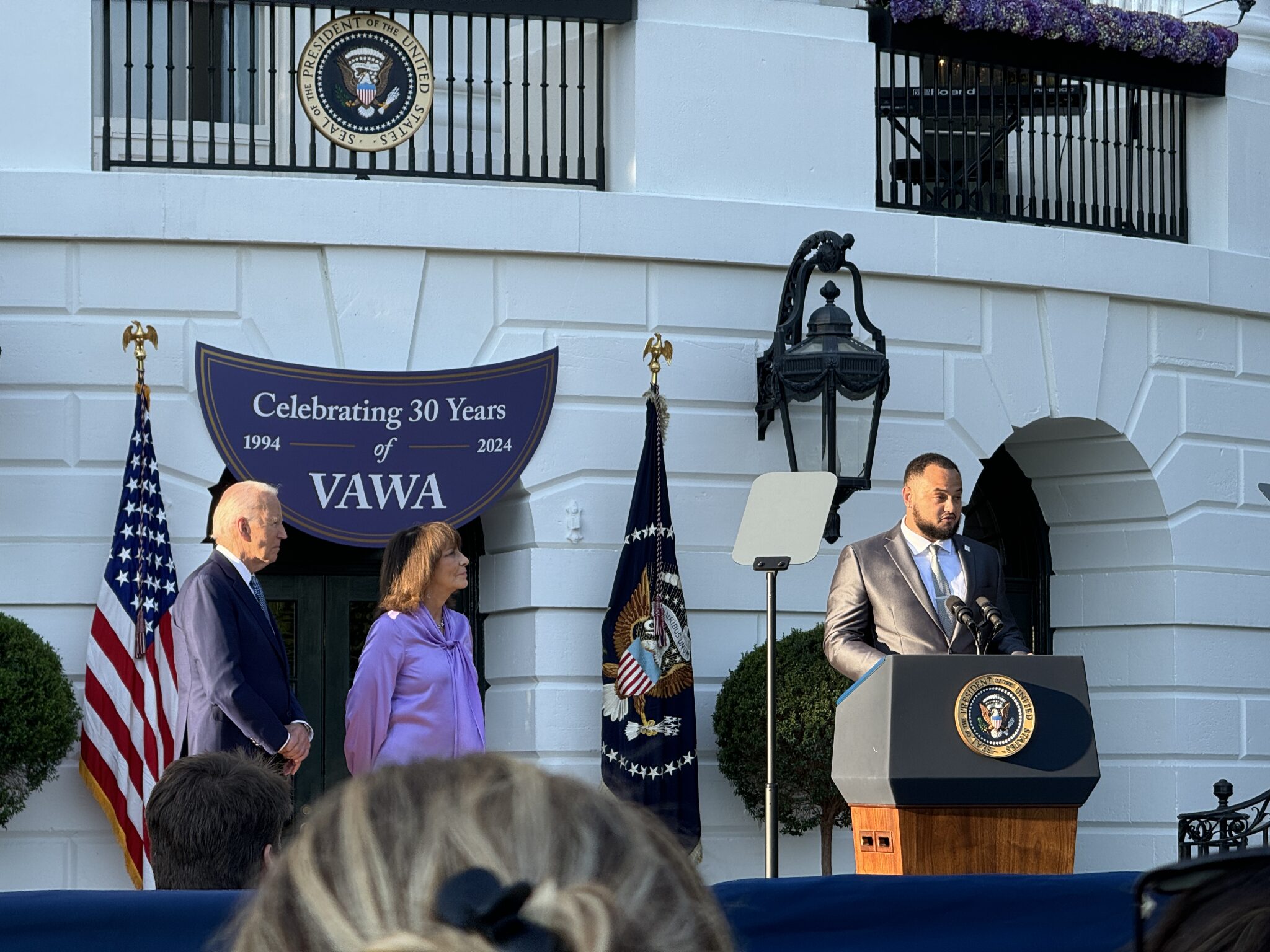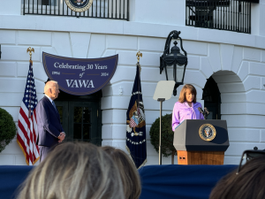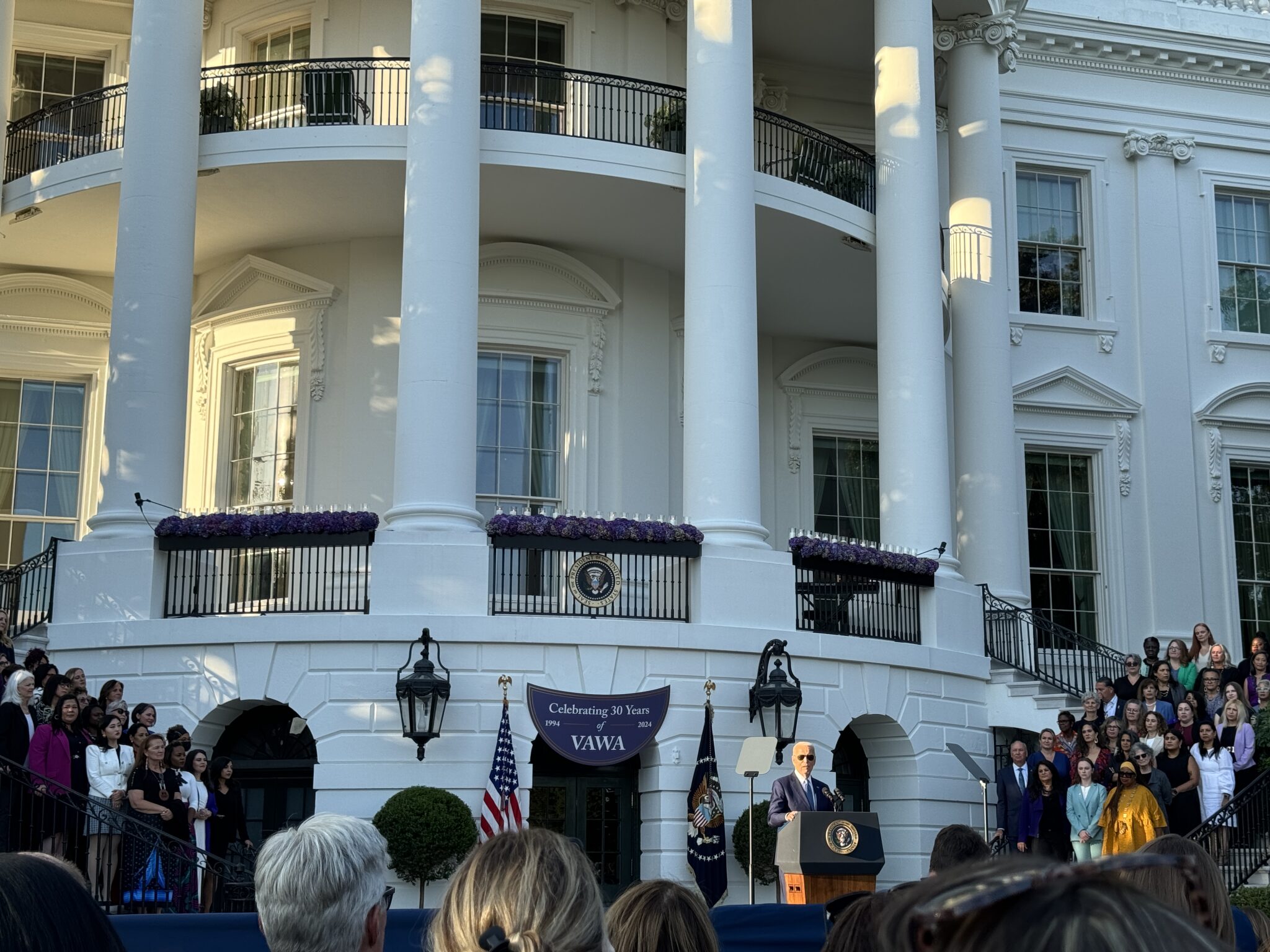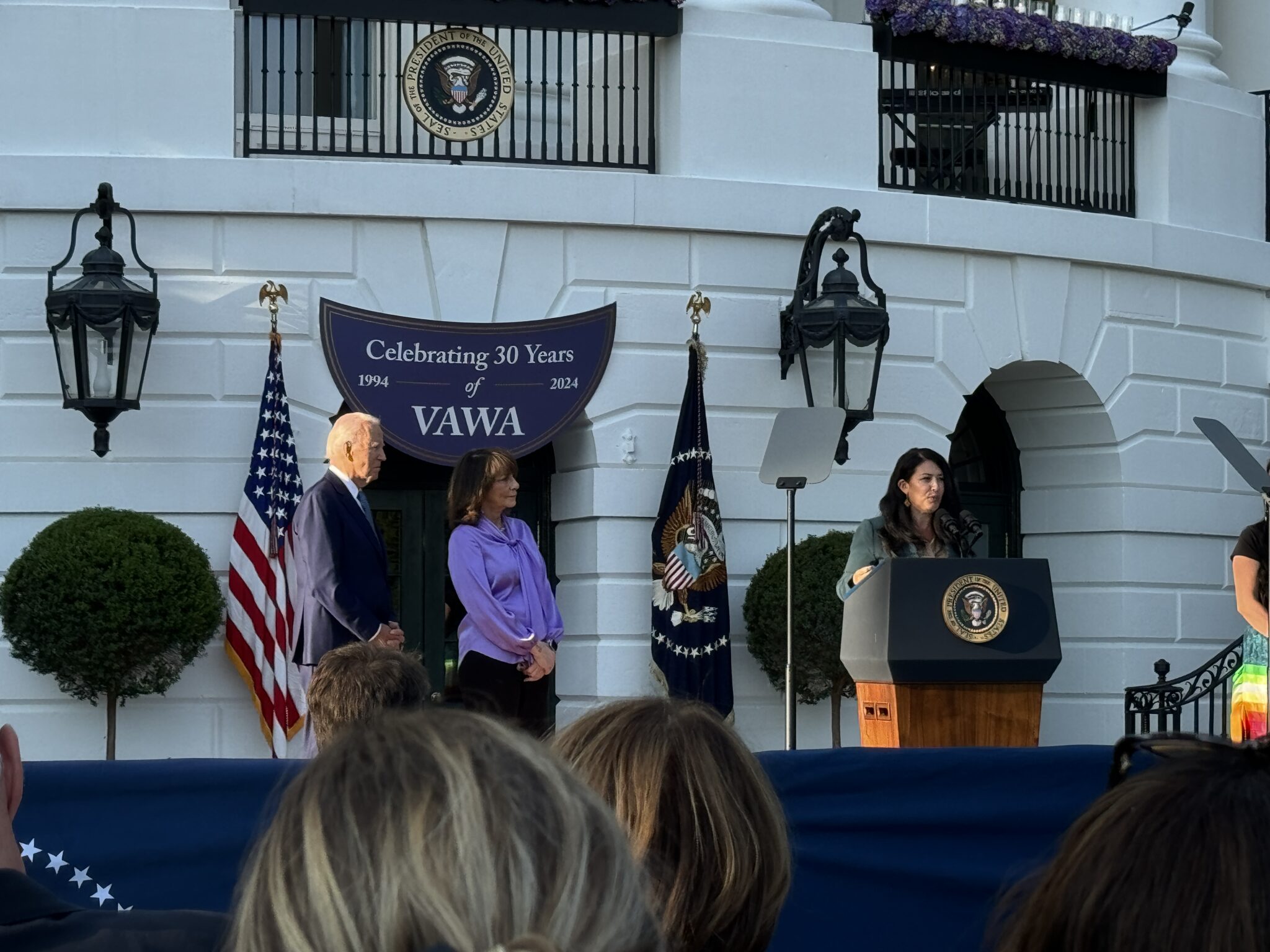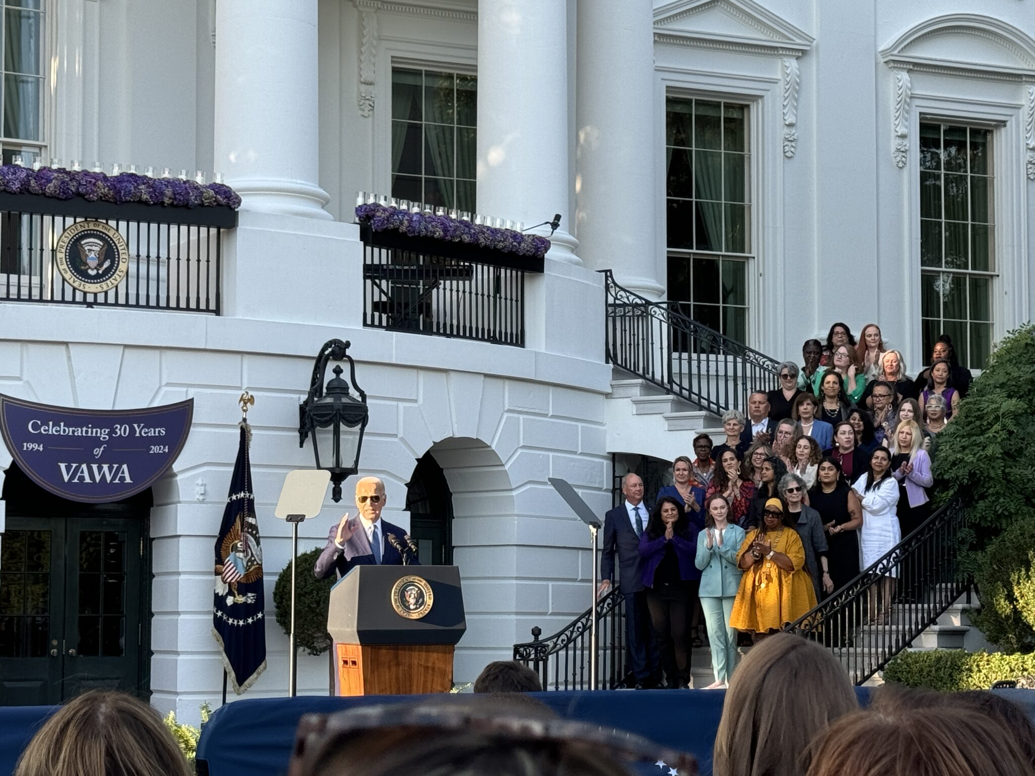 Following the briefing was the 30th Anniversary celebration on the White House Lawn. The event opened with a heartfelt performance by the Duke Ellington Choir and a poetry reading by U.S. Poet Laureate Ada Limón, who composed a new poem for the occasion. Other speakers included Kyle Richard, Associate Director for Men’s Engagement, It’s On Us; Nicole Matthews, Executive Director, Minnesota Indian Women’s Sexual Assault Coalition; and Ruth Glen, President of Survivor Justice Action. The final speaker was President Joe Biden. The President reflected on the past 3 decades, recalling the climate in 1990, when the idea of talking about domestic violence seemed even salacious to some. But he and others who met with victims and survivors knew that something needed to be done. We have these leaders to thank for the Violence Against Women Act, which would lead to a significant decrease in the rate domestic violence in the U.S. and ultimately a culture shift in how we approach and address domestic violence. President Biden stated that VAWA was the piece of legislation he was most proud of in his entire political career.