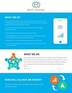 EQ collects real-time data metrics from health care employees through an iOS or Android mobile application and reports the data in a dashboard for our clients across 5 key domains (Respect/Value Safety/Culture/Hiring*Pay*Promotion)