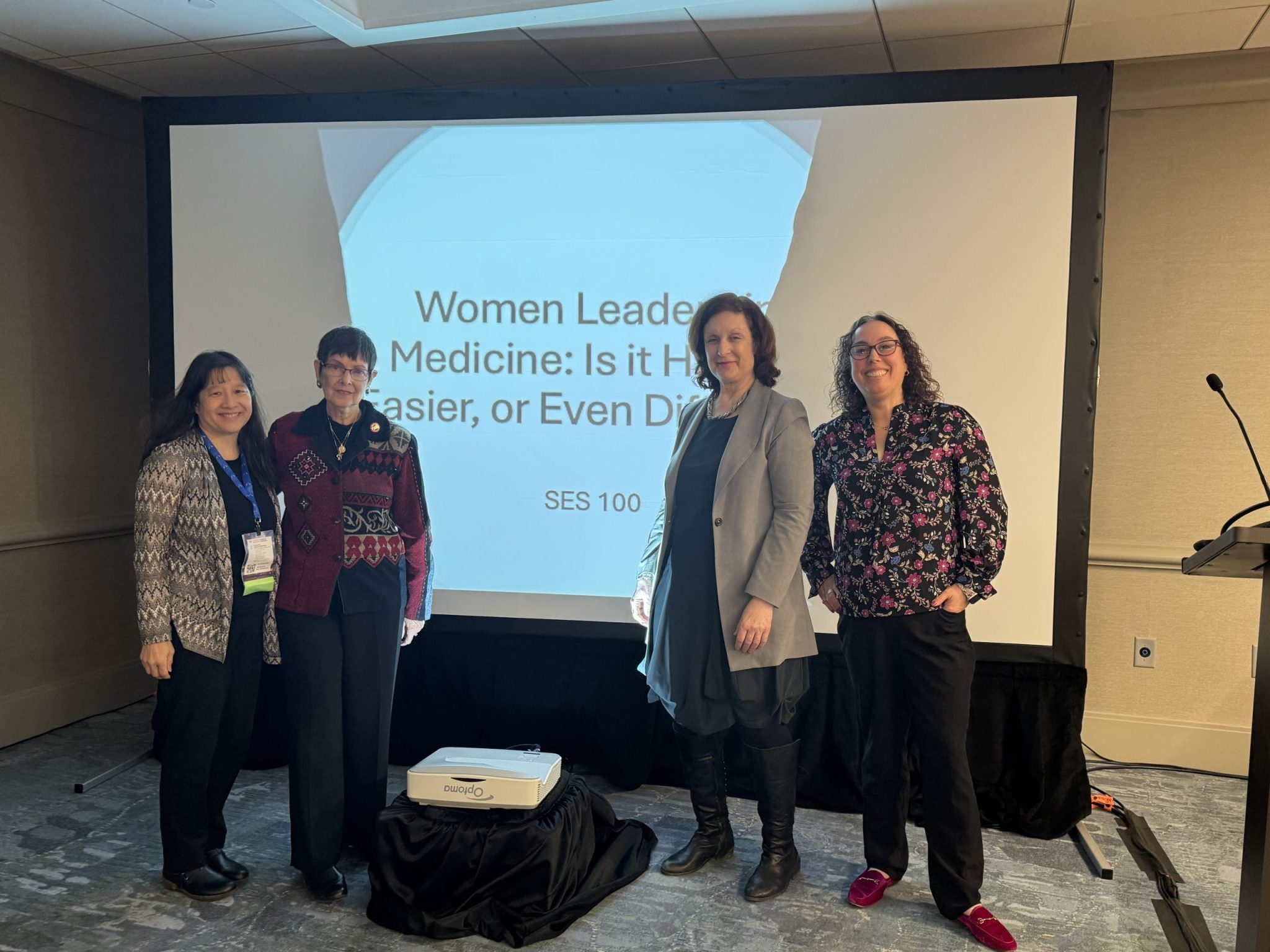 AMWA leaders—Dr. Karen Nichols, Dr. Kimberly Templeton, and Dr. Abby Spencer—were featured presenters in a session: Women Leaders in Medicine: Is it Harder, Easier, or Even Different? Dr. Yolanda Wimberly had been slated to speak but was unable to participate in the session. They were joined by AMWA Executive Director Dr. Eliza Chin, who helped bring the group together. The panelists, representing diverse backgrounds, shared insights from their leadership journeys: