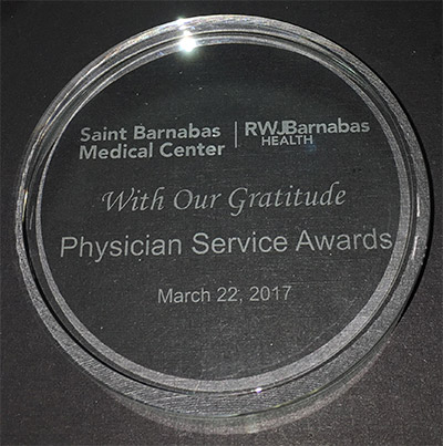 On March 22, Dr. Satty Gill Keswani was honored at the Physician Service Awards for a distinguished career of more than 40 years at Saint Barnabas Medical Center. She is proud to have been part of the Saint Barnabas OBGYN staff and to have practiced her specialty in Reproductive Medicine.