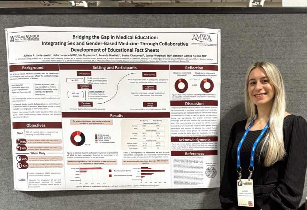 I’m Juliette Janiszewski. I currently work at Massachusetts General Hospital and hope to start PA school in 2025. I enjoyed the opportunity to present a poster for SGHC at the Society of General Internal Medicine National Conference in Boston, MA. This experience allowed me to expand on creating factsheets by evaluating the impact of this work. It was interesting to witness how many people were eager to learn more about the project and shared their own experiences of the importance of increasing accessibility to sex and gender-based medicine. Overall, my involvement in the project has expanded my understanding of patient-centric, individualized care and made me aware of vital gaps in research and clinical knowledge.