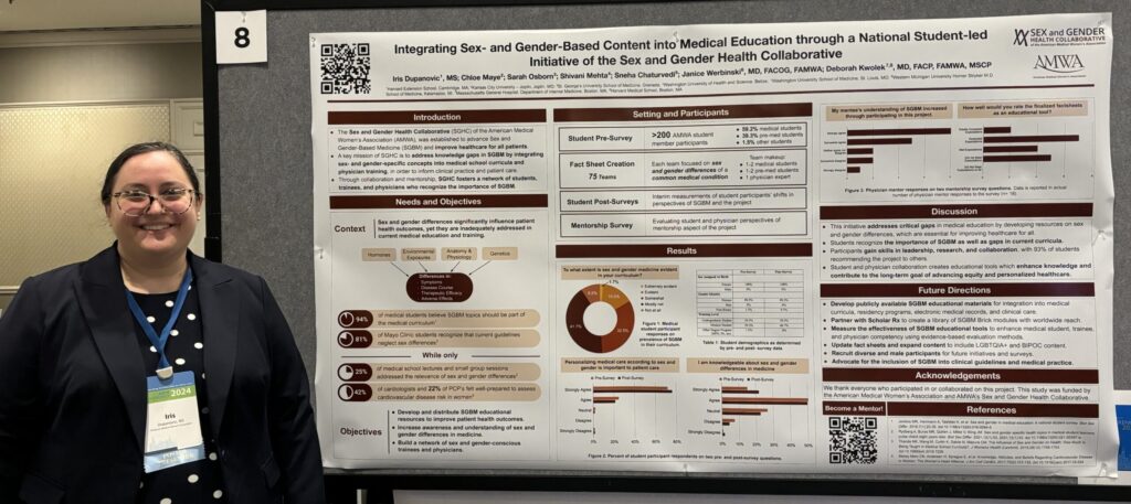 I’m Iris Dupanovic, a premedical student with a BS in Biopsychology and MS in Biomedical Sciences from Tufts University. My involvement with AMWA SGHC was sparked by a presentation at the 2023 AMWA Annual Meeting, which opened my eyes to an opportunity to take an active role in incorporating inclusivity into medical education and research. I initially joined the Evaluation Committee, and have recently had the opportunity to join the broader student leadership team.