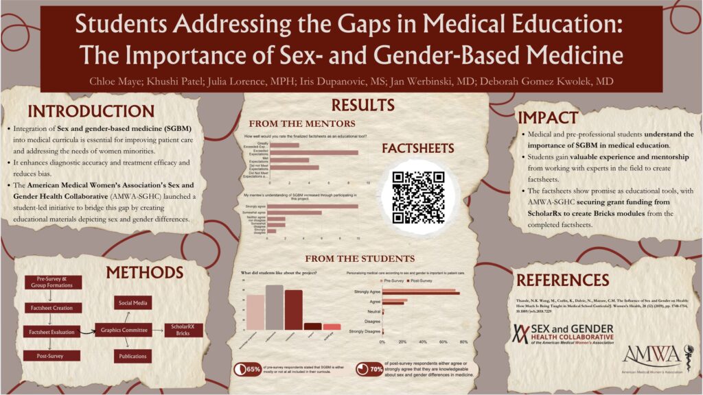 I’m Courtney Gorrell, a third-year medical student at The University of Toledo College of Medicine. I joined AMWA during my first year and have helped with several committees over the years, most recently the AMWA 108th Annual Meeting planning committee. I joined SGHC in 2022, when volunteers were needed to help create a resource of factsheets on how sex and gender differences affect the pathophysiology and expression of various diseases and conditions. Since joining, I have a better understanding of the importance of the subject and that there is a critical need within medical education for this information. I have been able to work with a great team of fellow students and physicians, and with their help, I was able to present our research at the SGIM 2023 Midwest Regional Meeting in Chicago.