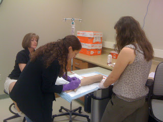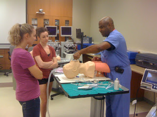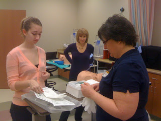| Teresa Janney, flight nurse for the University of Missouri Transport Team, teaches students Maria Story, Erin Pearson, and Alli Zanaboni techniques for venipuncture and blood draws. |
