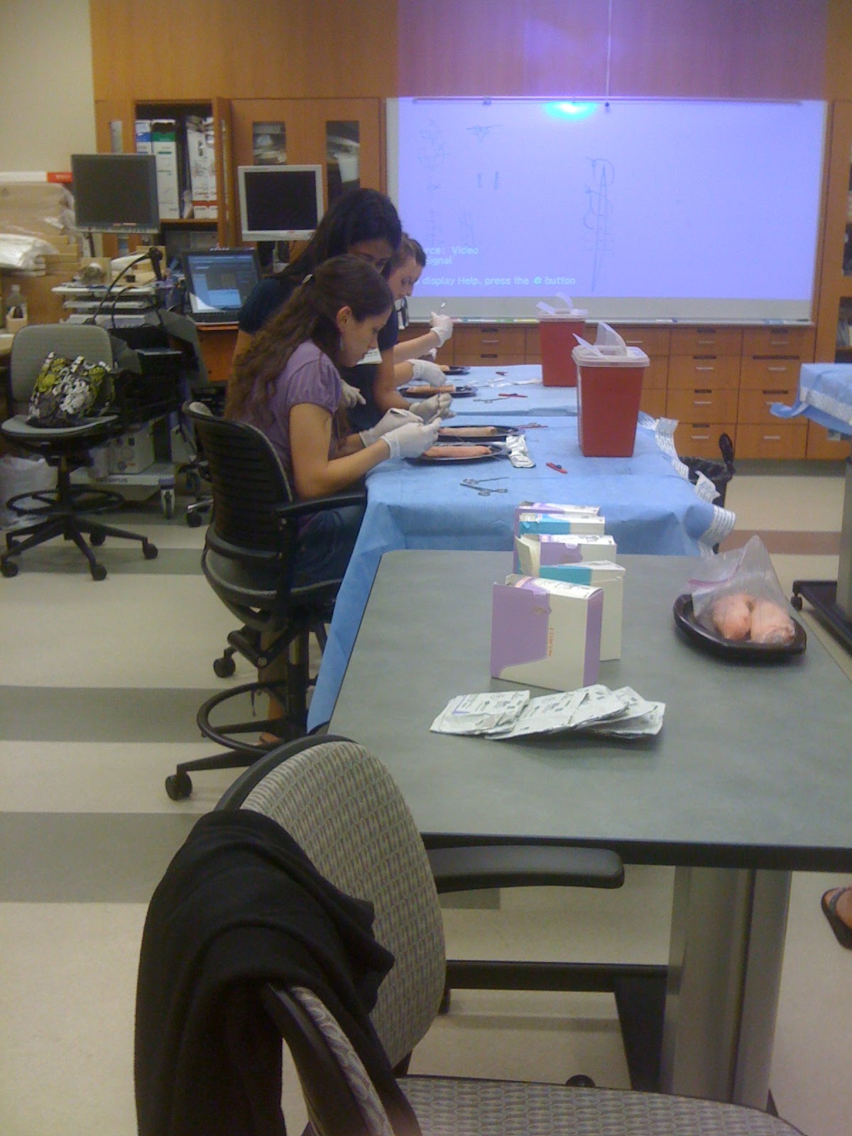 | Students practice their suture skills. |