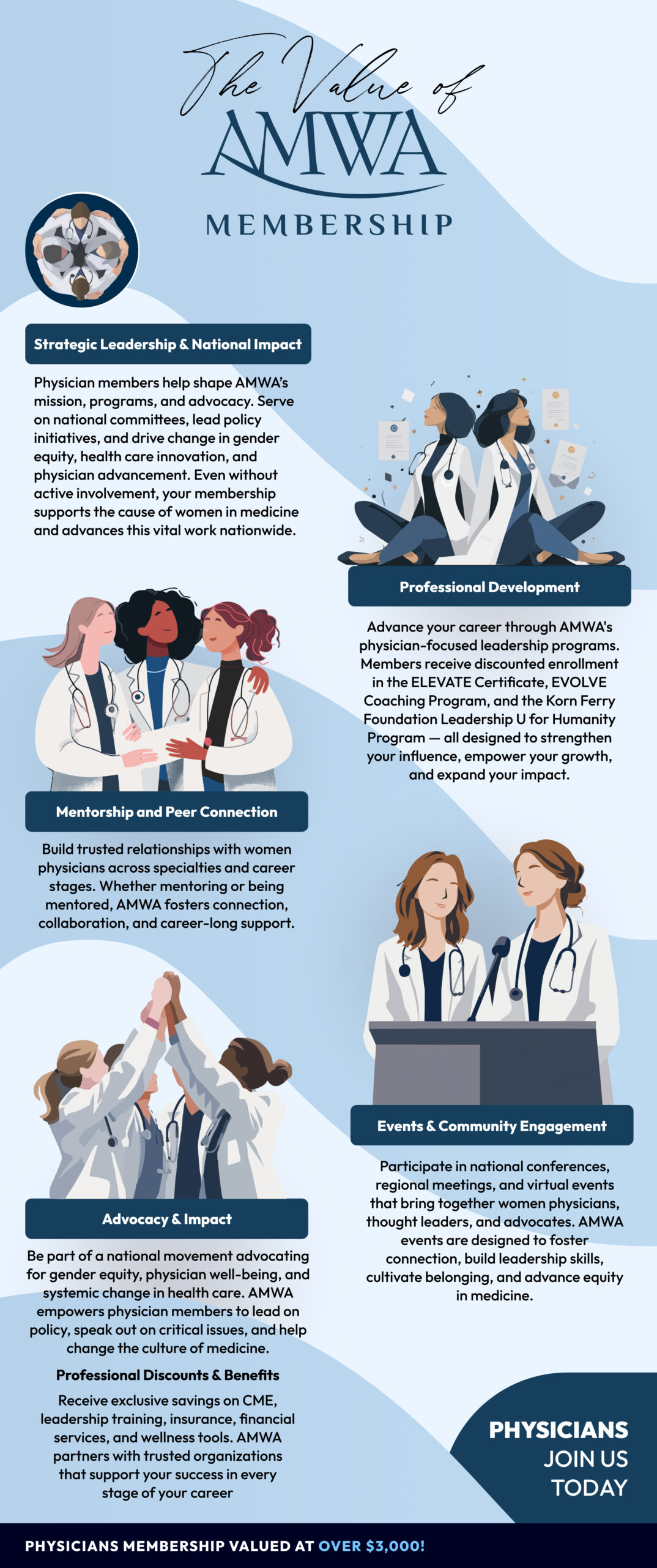 Affiliate members receive all AMWA member benefits except leadership positions, voting, special programs, and membership in the Medical Women’s International Association. Affiliate members may upgrade to full membership for $60.