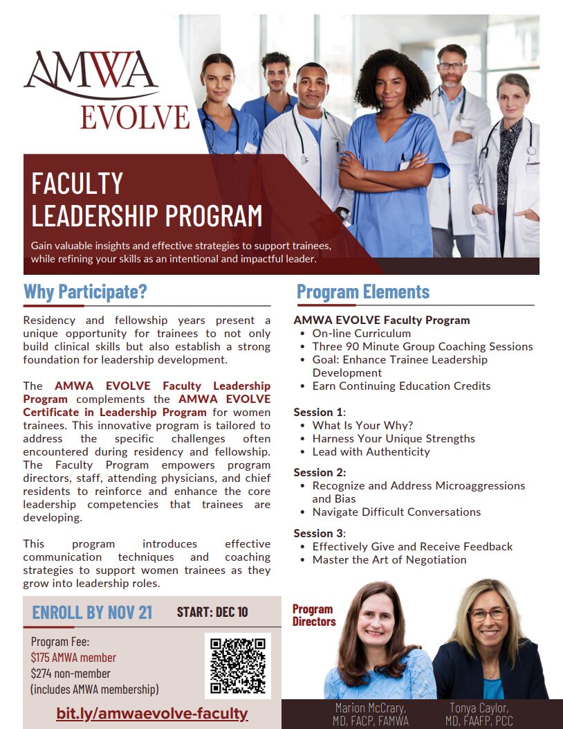 The AMWA EVOLVE Faculty Leadership Program complements the AMWA EVOLVE Certificate in Leadership Program for women trainees. This innovative program is tailored to address the specific challenges often encountered during residency and fellowship. The Faculty Program empowers program directors, staff, attending physicians, and chief residents to reinforce and enhance the core leadership competencies that trainees are developing.