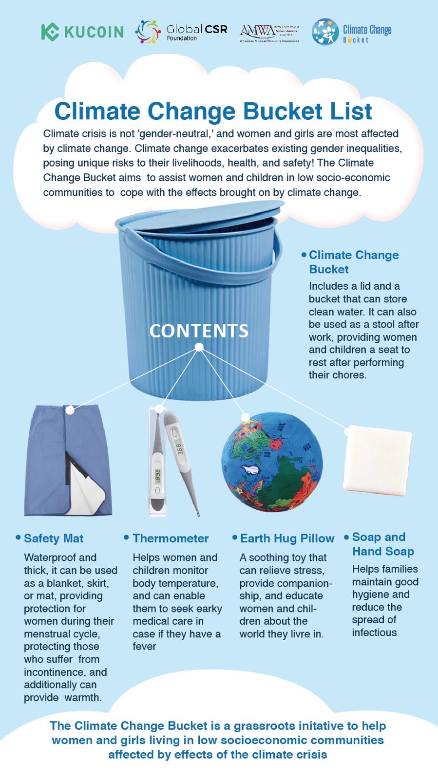 In 2023, AMWA, in partnership with Global CSR Foundation launched the Climate Change Bucket campaign, thanks to the generosity of KuCoin. This campaign, as part of the American Women’s Hospitals global health work, consisted of delivering Climate Change Bucket kits to underserved areas. Components of the kit included a bucket for carrying and storing clean water (doubling as a stool), a waterproof safety mat that can also be used as a blanket, skirt, or protection for menses and incontinence, thermometer to monitor for early illness, Soap to prevent infections, and Earth Hug Pillow to provide comfort.