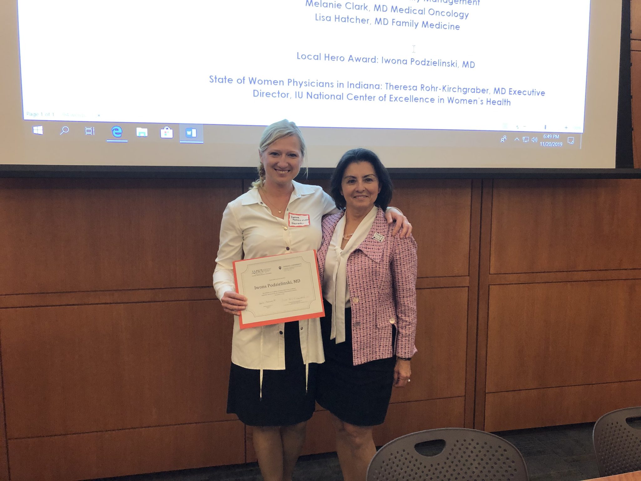 Iwona Podzielinski, MD GYN Onc in Fort Wayne, IN was awarded the AMWA Local Hero’s Award on November 20, 2019, at the IUSM Ft Wayne Women Physicians and Student Evening of Celebration.