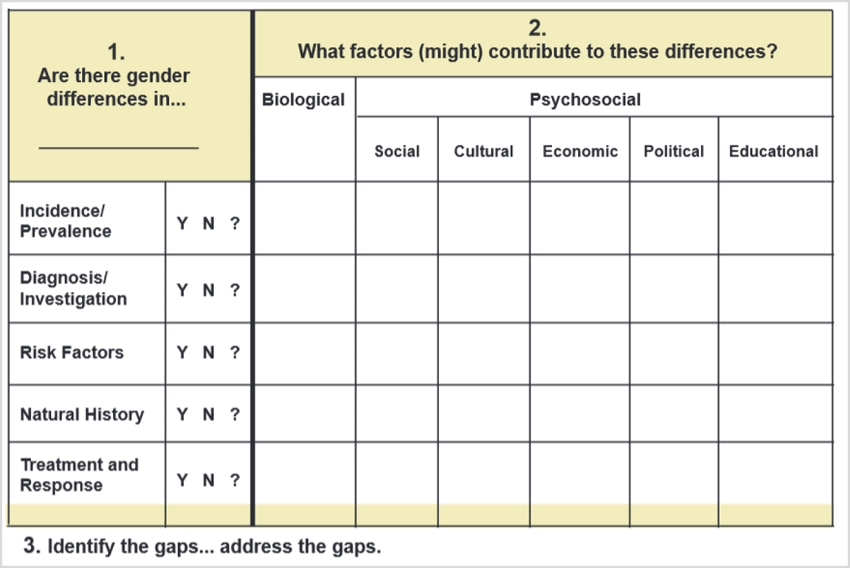 The Gender Lens Tool can be used to identify gaps and differences in health information from a gender perspective. By using a Gender Lens, we can examine any area of the medical literature and create a health-cased framework to consider how the multiple biopsychosocial spheres of influence contribute to a woman’s health.