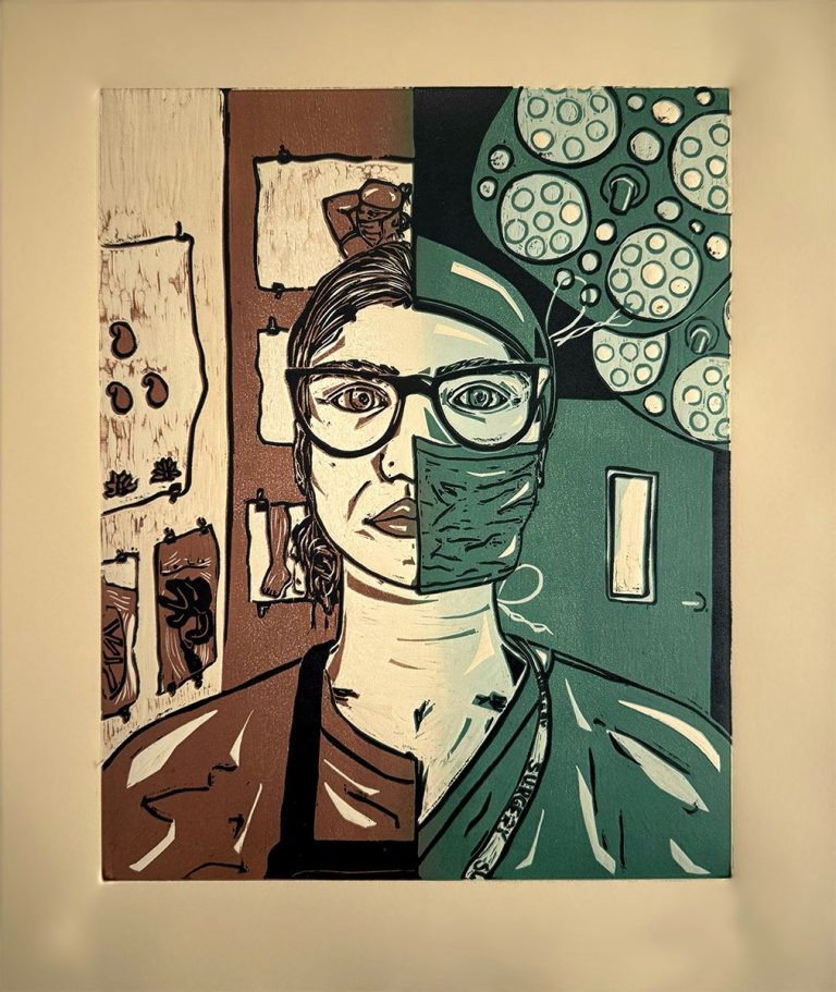 “As I continue to explore this synergy between surgery and printmaking, I am confronted by the facets of my identity in the contrasting spaces I find myself. In my studio, in graduate school, building a community among other artists. As a surgical resident in the hospital, entering the operating room, caring for patients. As a woman in each of these spaces. Then, finding myself in both spaces holding the identity of the other. And as entirely separate, third, fourth, and fifth identities as a backpacker, climber, singer, South Indian, American, daughter, sister, wife, and friend. My work seeks to explore the relationship of these identities to each other and how they appear in my practice as both surgeon and artist.”