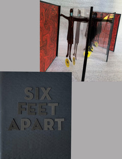 “Six Feet Apart is an accordion style book depicting social distancing. I used the clear polymer background because so many of us are behind shields and glass during the pandemic. The 6ft/2m circles are like the ones we see for queues everywhere. You’ll notice that I chose an imprint of high heels. The love stethoscope seemed the best image for this lady doctor. Technique: Computer designed images were made into decals, and the stickers were applied to the clear plastic. The joins are dyed Tyvek or Satin binding tape. The covers are made of leather-look book binding paper and marbled end papers. The cover letters are black Cappuccino Thickers from American Crafts. The dimensions are 9 x 11 x 0.8 inches.