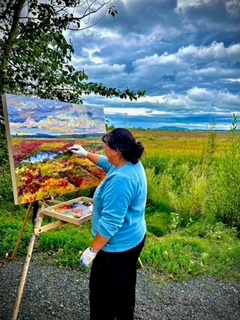 A Vietnamese refugee, Sami lived in Pennsylvania, Texas, Illinois, Alabama and Louisiana before settling in Alaska, so through the years she learned to be adaptable and find creative outlets for herself. She never shies away from a challenge, so the challenge of alla prima oil painting, especially plein air painting, appealed to her sense of creativity and reward. Her bold and whimsical approach to representational painting contributes to her modern style, as does her textural use of paint and her intuitive sense of color. She loves working in a wide landscape format as she sees the world through this dynamic lens, and she finds portrait painting analogous to completing the Sunday NY Times Crossword. Her 2022 art show “The Mind of a Healthcare Worker During the COVID-19 Pandemic” garnered international media attention.